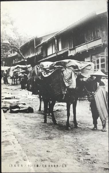 〈絵葉書〉馬籠ノ名物馬方 雨天ノ繭付ケ(今ノ馬籠風景)