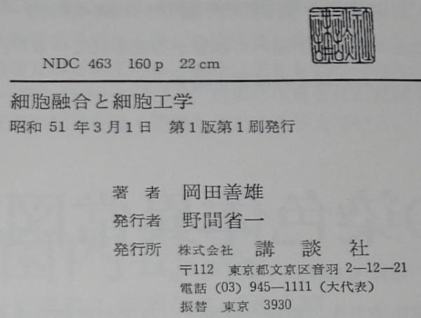 • 解説 細胞融合と細胞工学 岡田善雄 講談社サイエンティフィク 昭和51年3月第1刷 A5判ハードカバー.