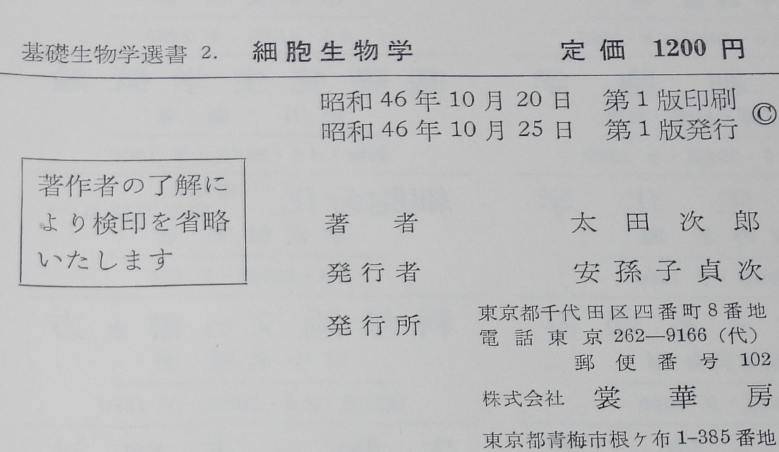 • 解説 基礎生物学選書2 細胞生物学 太田次郎 裳華房 昭和46年10月第1版 A5判ハードカバー221p.