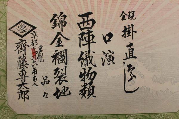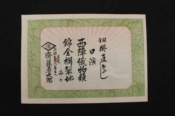 5 5 引札 引き札 西陣織物類 京都東洞院 齊籐専太郎 石版色刷 約26×37㎝
