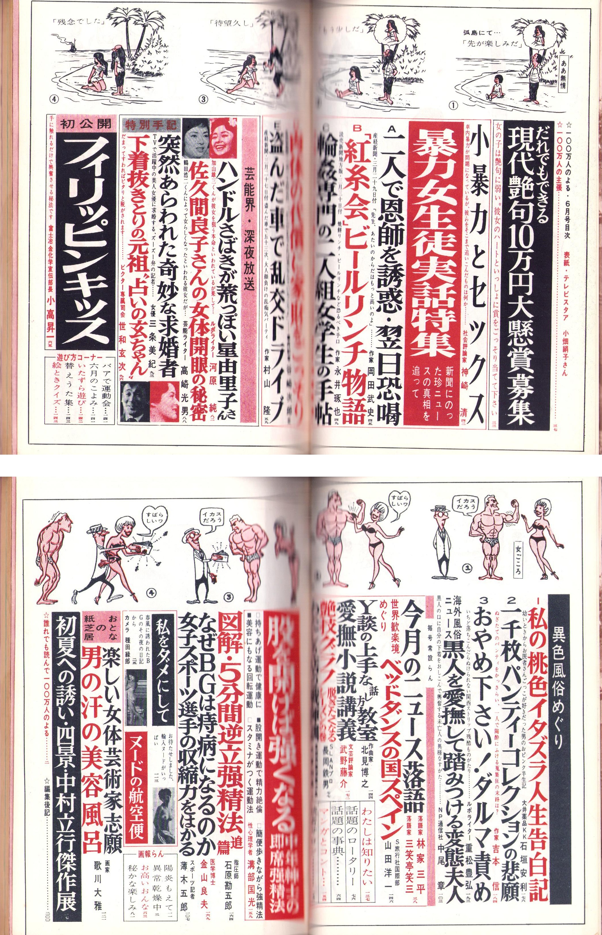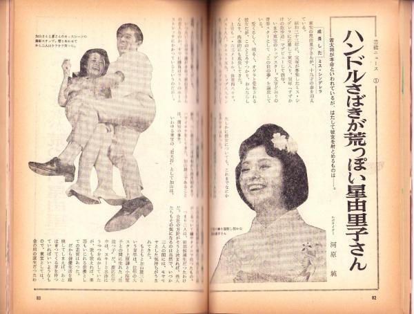 • 著者 〈ハンドルさばきが荒っぽい星由里子 6頁〉〈佐久間良子さんの女体開眼の秘密 5頁〉〈三条美紀「特別手記 突然あらわれた奇妙な求婚者」3頁〉〈おとなの紙芝居 歌川大雅「楽しい女体芸術家志願」8頁〉〈歌川大雅「男の汗の美容風呂」8頁〉、五月みどり