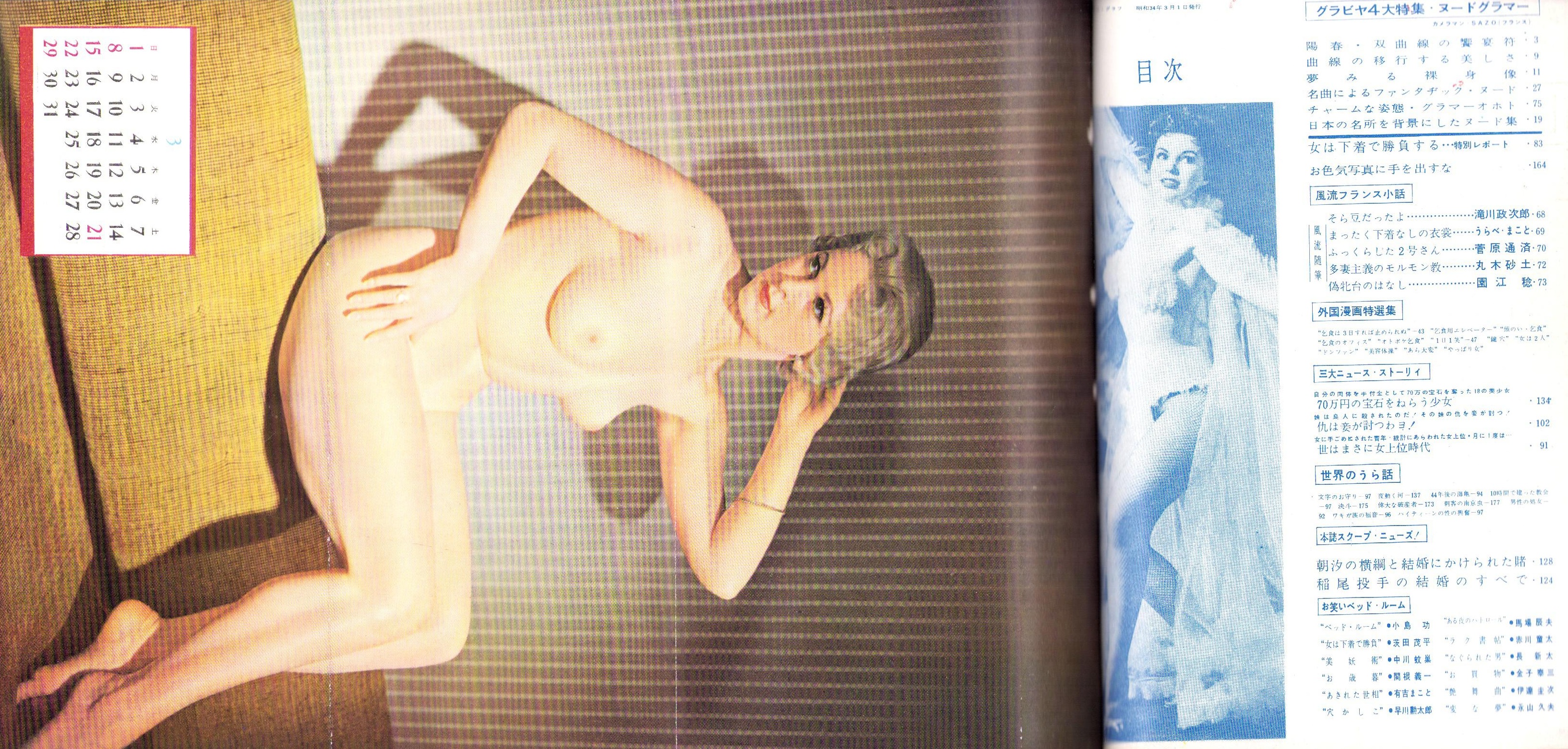 • 著者 〈特集 フランスの裸女〉〈上条美佐保、姿まゆみ、小川久美、万里昌代 各モノクロ1頁〉〈女は下着で勝負する 8頁〉〈朝山蜻一「逢びきはやめろ」7頁〉、うらべ・まこと、丸木砂土、菅原通済