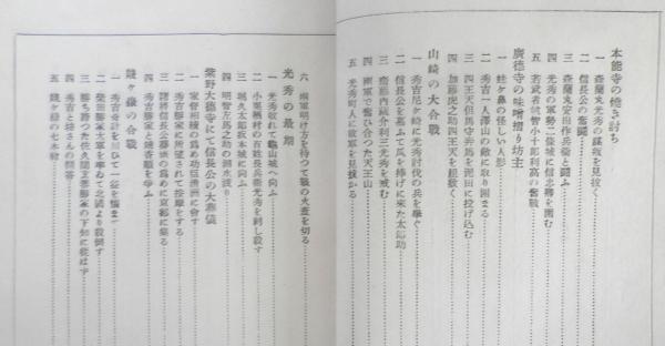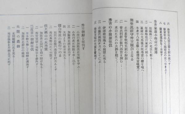 幼年時代 藤吉郎時代 浅井朝倉の征伐 羽柴筑前守時代 明智日向守光秀の話 本能寺の焼き討ち 廣徳寺の味噌摺り坊主 山崎の大合戦 光秀の最期 柴野大徳寺にて信長公の大葬儀 賤ヶ岳の合戦 秀吉家康小牧山の対陣 羽柴筑前守秀吉関白となる 秀吉の小田原征伐 秀吉朝鮮を征伐す 関白秀次の乱交つのる 伏見桃山の大地震 二度目の朝鮮征伐 太閤の薨御