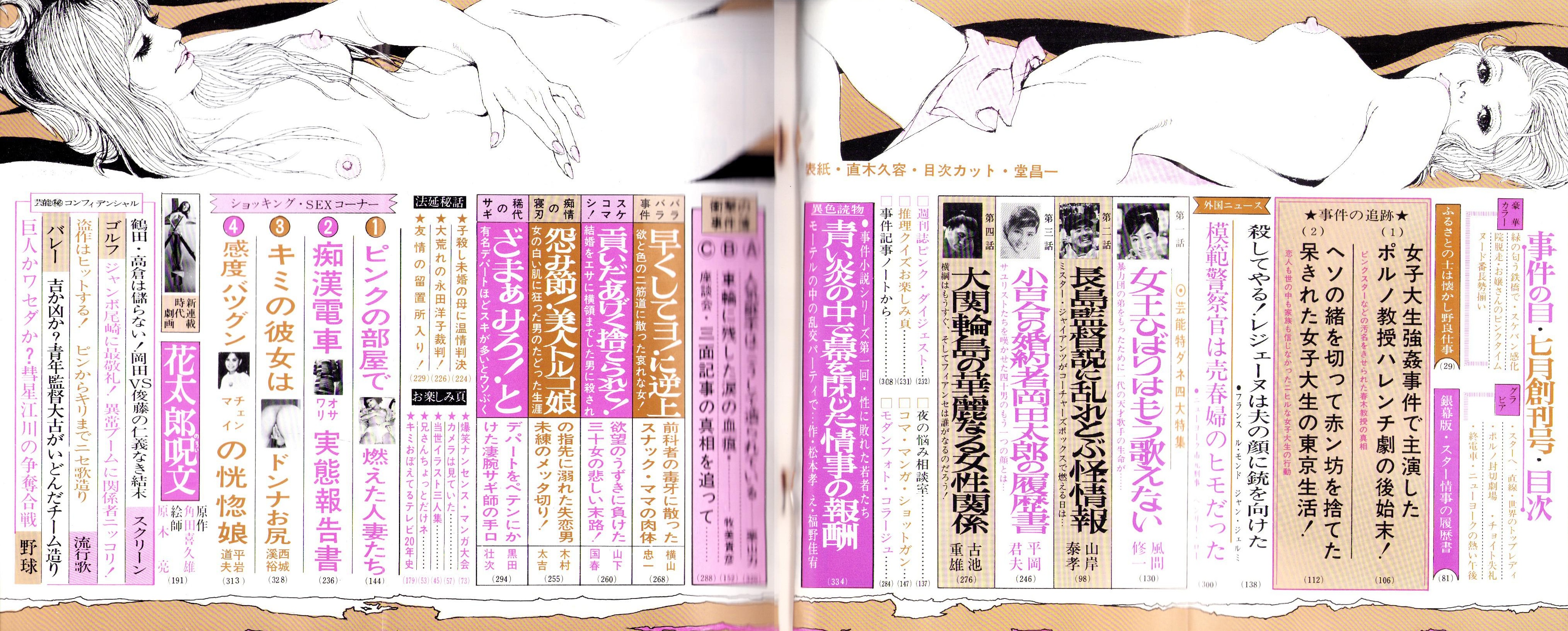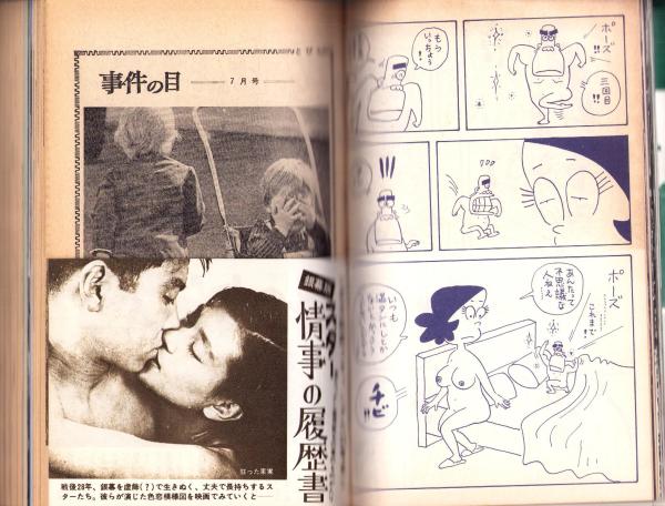 • 著者 〈若きアイドルたち -江川卓、太田美鈴、中島ゆたか、浅田美代子- 各モノクロ1頁〉〈水野良太郎・絵と文「兄さんちょっとだけね -特出し姐ちゃん奮戦記- 2色4頁〉〈銀幕版 スター情事の履歴書 -日本映画スキャンダル25年史- 1/2頁サイズが16頁〉〈芸能界うわさの裏窓 花形スター(秘)コンフィデンシャル -鶴田浩二、高倉健、ジャンボ尾崎、長島とおる、大古誠司、江川卓ほか- 10頁〉〈女王ひばりはもう歌えない? 8頁〉〈吉永小百合の父親がゴネた岡田太郎のもう一つの履歴書 8頁〉〈大関輪島をめぐる華麗なる女性関係 8頁〉〈人気歌手はこうして造られる -山本リンダ、朱里エイコ、五月みどり、梶光夫ほか- 8頁〉〈キミの彼女はドンナおシリ? 5頁〉、原木亮、平田羊、小悪征夫