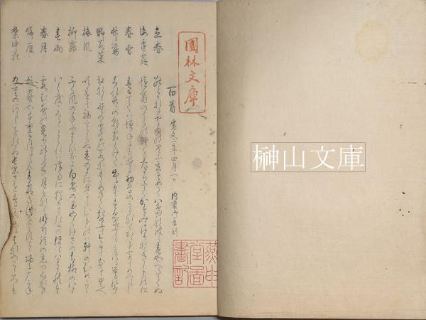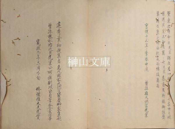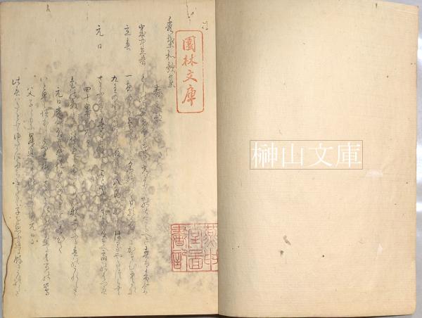 和本、拵帙、蔵印「園林文庫」「燕申堂図書記」あり、火災による濡シミと余白少焼損を丁寧に修理されているが修理後の虫損あり、並