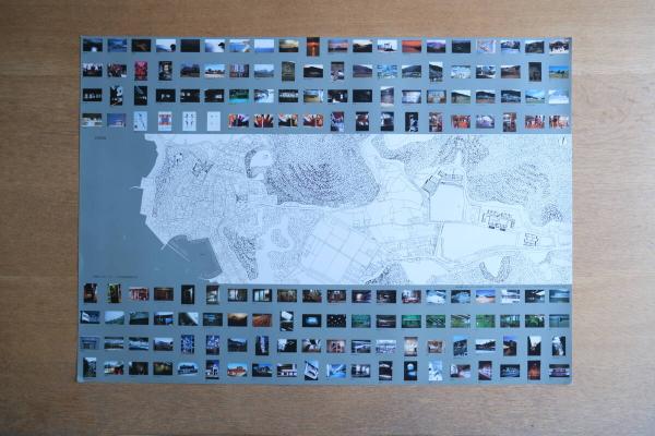 都市スケールの敷地図と建築写真を組み合わせた構成で、1980年代日本建築のリサーチ的視点をよく示す図版。四隅に軽度のヨレはあるが全体状態は良好。
