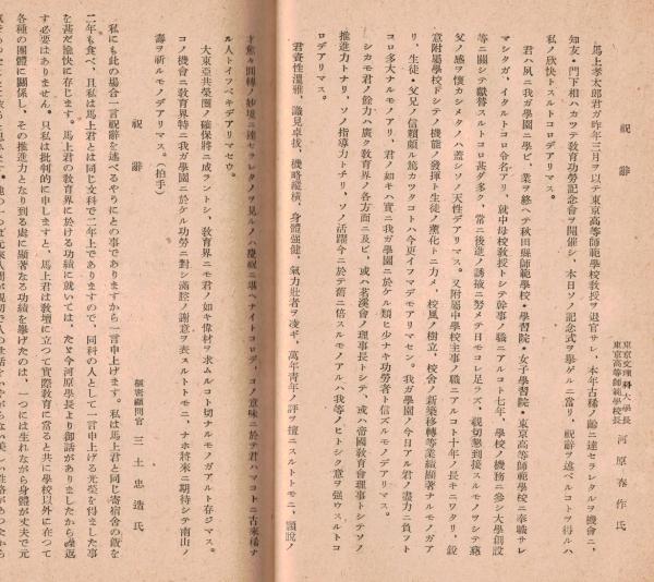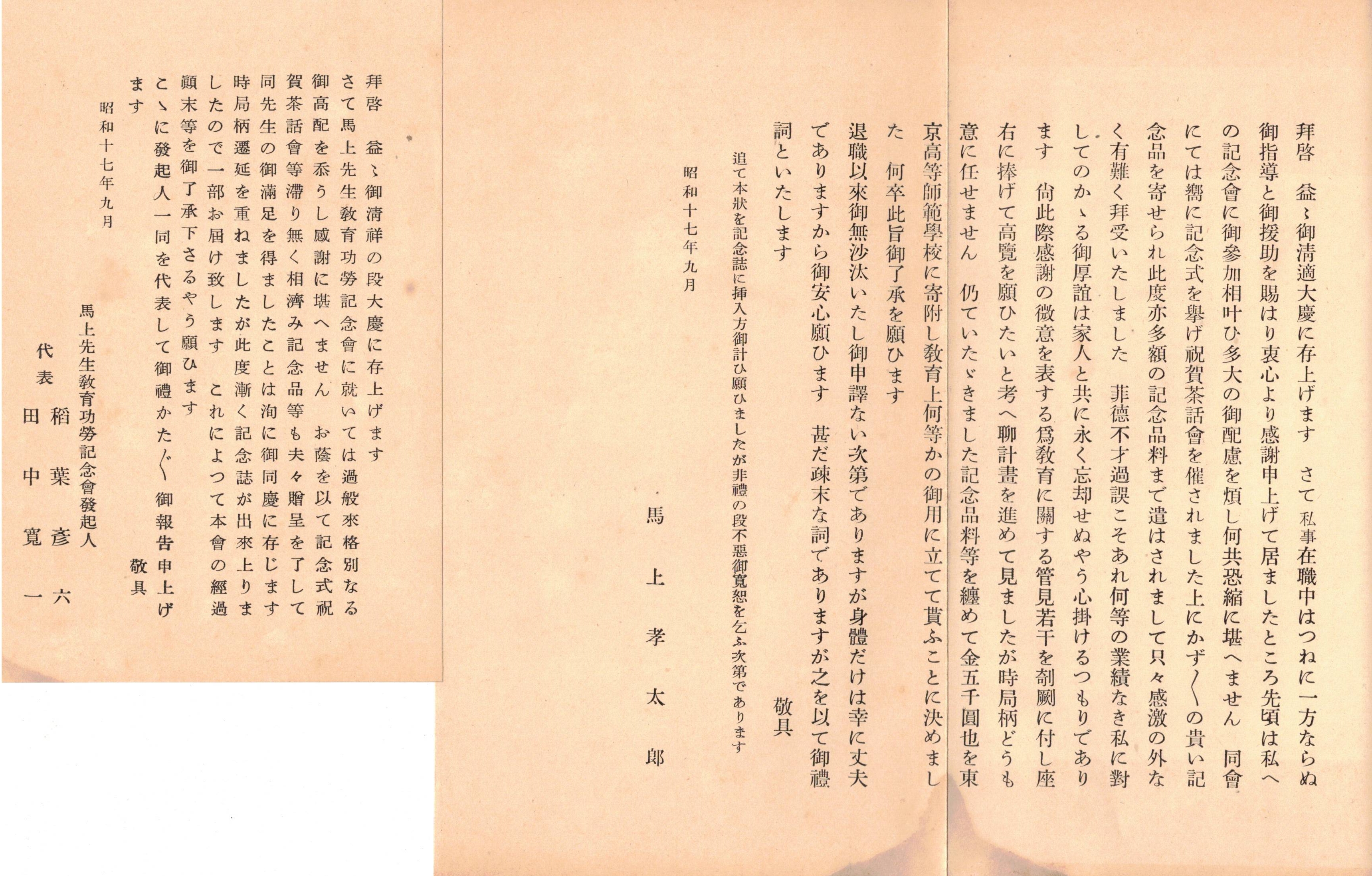 ※記念志 馬上孝太郎先生教育功労記念會(茗渓會理事長等) &礼状等