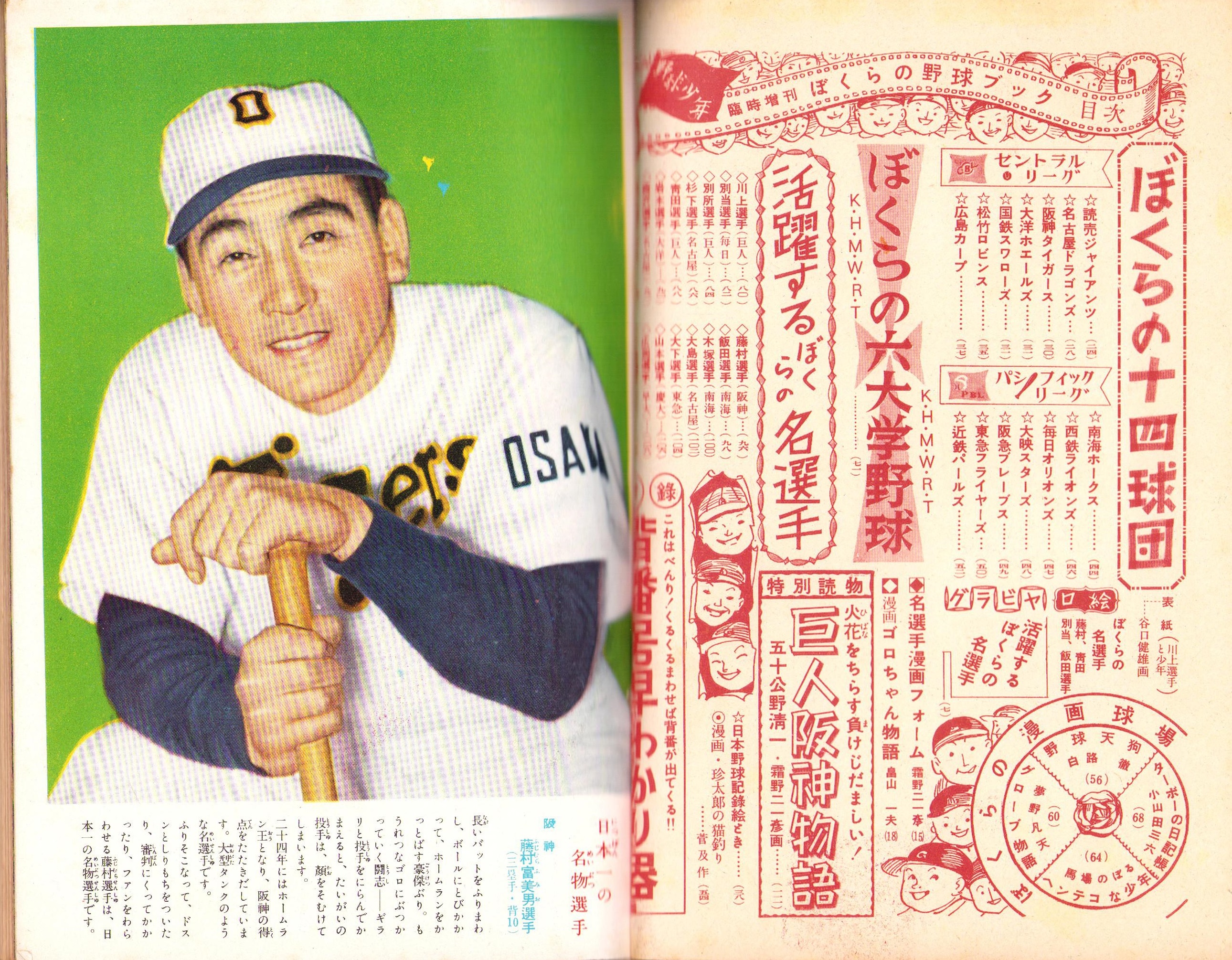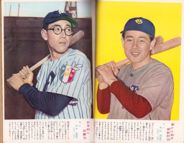 • 著者 〈藤村富美男、青田昇、別当薫、飯田徳治 各カラー1頁〉〈霜野二一彦・画「名選手漫画フォーム」2色3頁〉、五十公野清一、畠山一夫、馬場のぼる、白路徹、夢野凡天、小山田三六