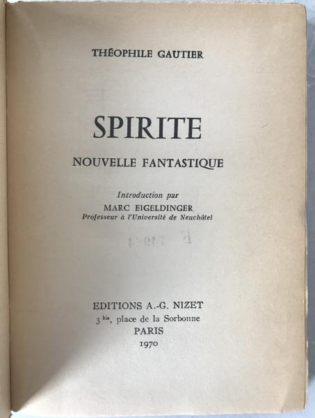 • 解説 This volume features Marc Eigeldinger’s important critical introduction. Spirite (1865) reflects Gautier’s mature exploration of spiritualism, aesthetic idealism, and transcendental love. Reissued in 1970 amid structuralist reevaluations of the “Fantastique,” Eigeldinger analyzes its mythological and phenomenological dimensions, including the “solar image” and the dematerialization of objects. Bibliographic data: Gautier; editor Eigeldinger; Nizet, Paris; 1970; softcover in 12; French. Condition: Good, ex-library, with Japanese institutional stamps and call numbers. Wrappers show age-toning; uncut edges; clean interior; fragile binding typical of 1970s paperbacks. Nizet editions are out of print and increasingly scarce.