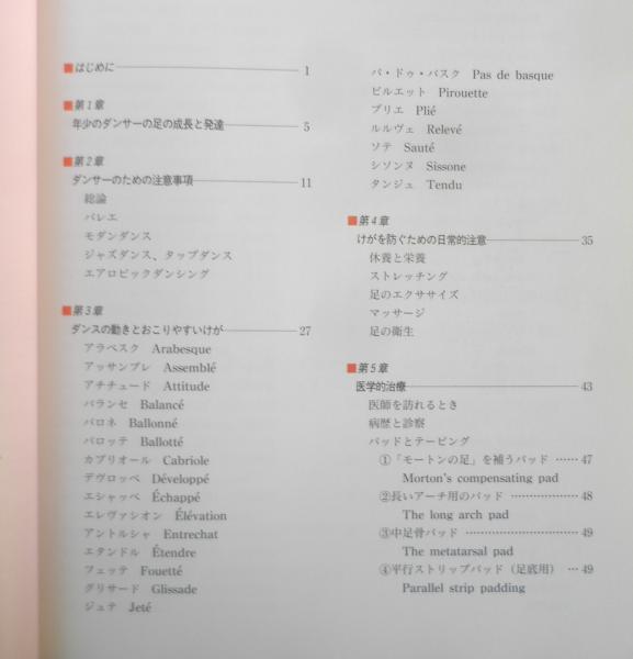 Telly L. Spilken著 小川正三監訳・安井慎一訳 第1章/年少のダンサーの足の成長と発達 第2章/ダンサーのための注意事項 第3章/ダンスの動きとおこりやすいけが 第4章/けがを防ぐための日常的注意 第5章/医学的治療 第6章/ダンサーの足のトラブル・用語 付録1/足とその動き・用語 付録2/足の構図・図解 他