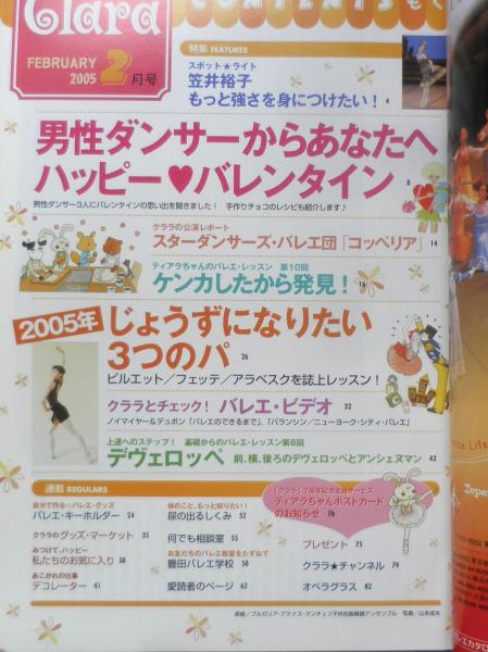 スポットライト/笠井裕子・もっと強さを身につけたい! 男性ダンサーからあなたへハッピーバレンタイン クララの公演レポート/スターダンサーズ・バレエ団「コッペリア」 ティアラちゃんのバレエ・レッスン第10回/ケンカしたから発見! 2005年じょうずになりたい3つのパ 上達へのステップ!基礎からのバレエ・レッスン第8回/デヴェロッペ 他