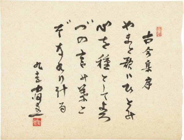 • 解説 34×45 『古今集序』 古今集序 やまと歌はひとの心を種としてよろづの言の葉とぞなれりける 九十五 中河与一 #八木書店近代自筆物/4.書画類 #94号近代文学特輯 code08950 ※自筆物につきましては、毎月25日前後に新蒐品を追加しております。PDF形式で御覧になりたい方は https://company.books-yagi.co.jp/archives/news/10928 を参照ください。
