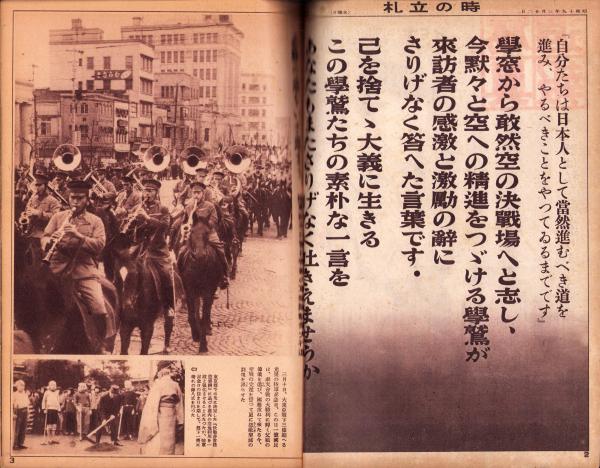 • 著者 〈兵器は私たちで造りませう〉〈陸軍記念日帝都の軍楽隊騎乗大行進〉〈学鷲の出撃近し -○○海軍航空隊-〉〈出陣近き学鷲との座談会〉〈工場はあなた方挺身隊を待つてゐます〉〈急げ待避所の強化〉〈来た来た活動写真が汽車に乗つて -北海道-〉