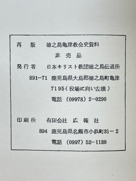 徳之島 亀津教会史資料 旧、日本メソヂスト教会 再版