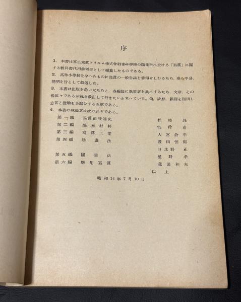 本書『寫眞』は、昭和14年(1939年)に富士写真フィルム株式会社(現・富士フイルム)が編纂した、写真技術に関する体系的な教育書です。当時の富士写真フィルム株式会社青年学校の教材として位置づけられ、写真技術全般を基礎から学べるよう編集されています。