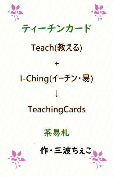 【ティーチンカードの使い方】 ティーチンカードは基本32枚のカードです。 (人間関係などを占う時のために男女のカードはプラス1枚ずつ入って います。) 易経は64卦で構成されており、1~64の順番があります。 そして卦の1番と2番、3番と4番・・・・・・と続くカードは「逆」というコンセ プトの元に並べられています。 「逆」というコンセプトに基づき、2つの卦を1枚のシンボルカードにし たのが「ティーチンカード」です。 カード右下の漢字2組は易経の64種類ある 「卦」です。 ティーチンカードは 「易」に始めて触れる方のために少しハードルを下げ、 2つの「卦」の意味するところを私なりの解釈でひとつのシンボルとしま した。 さらに、そのシンボルの意味を補足するために「詩」を載せています。 最初には「シンボル」からイメージするものと「詩」からイメージする もので占いにお使いください。 そして、易経に興味を持ったなら右下の漢字の「卦」に注目してくださ い。 易経・易占の解説書ではないのでここでは省きますが、 たくさんの書籍 やインターネットで情報が集められるでしょう。 裏面は上下左右が分からない仕様のカードなので 逆位置を利用することで「イーチンタロット」としてもお使いいただけ ます。 (左の漢字を正位置・右の漢字を逆位置とするなど、ご自分の使いやす い方法を採用してください) カードの意味は自由な解釈でお使いください。 元は「易経」ということを頭の片隅においていただければ カード作成の意図したところから大きくはずれることはありません。 どうぞ、手にしたあなたなりの使い方で自由にお役立てください。from 三波ちぇこ先生