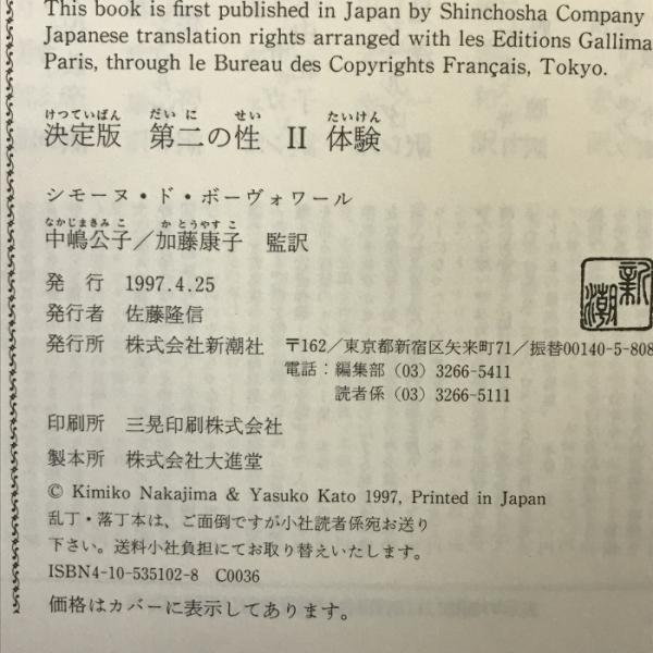 決定版 第二の性〈2〉体験  新潮社 シモーヌ・ ド・ボーヴォワール