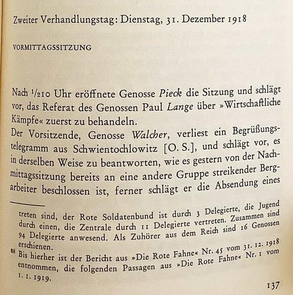 ・第2会議日 1918年12月31日 (午後):ローザ・ルクセンブルク「われわれの綱領」. 討論. 採決. ヒューゴー・エーベルライン「われわれの組織」. 中央委員会の選挙. ヘルマン・ドゥンカー「国際会議」.