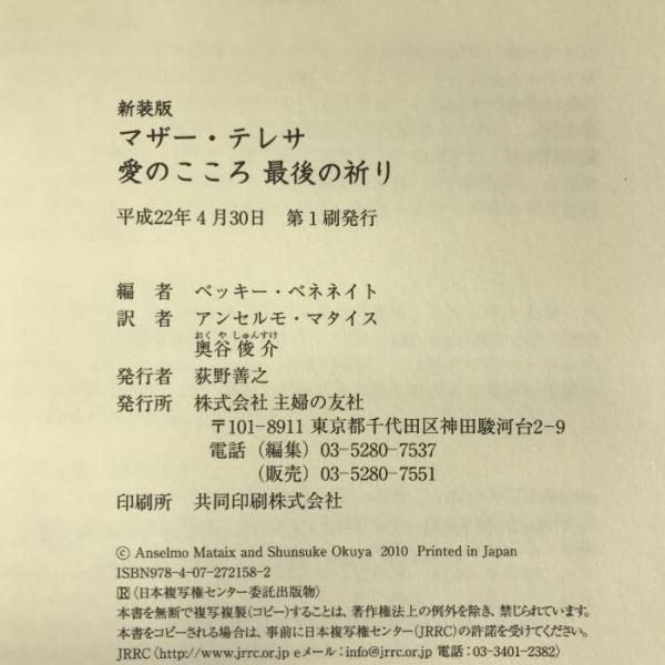 新装版 マザー・テレサ 愛のこころ最後の祈り 主婦の友社 ベッキー・べネネイト