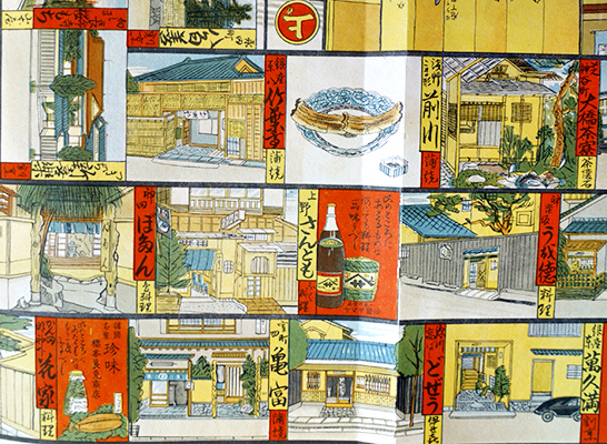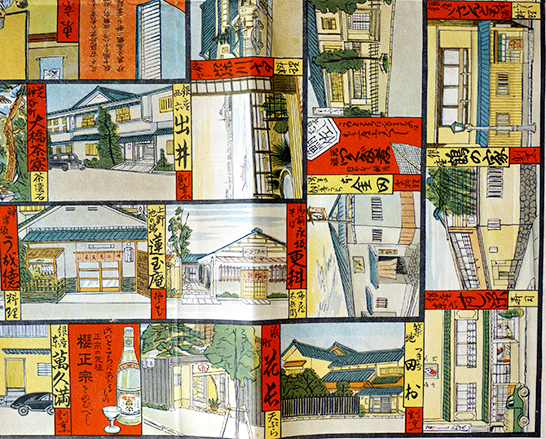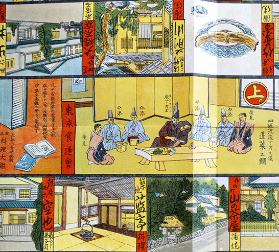 日本料理研究家長谷川青峰が私家版として頒布した彩色石版画摺の双六の復刻版。築地魚河岸に始まり、