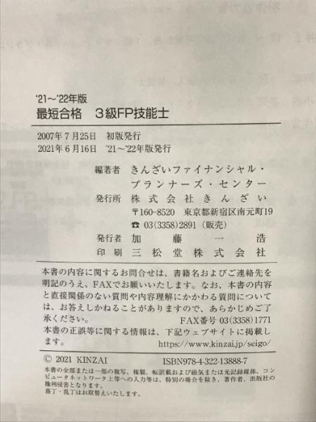 '21~'22年版 最短合格 3級FP技能士 きんざい きんざいファイナンシャル・プランナーズ・センター