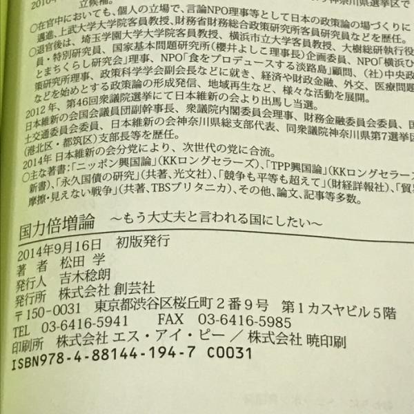 サイン本 国力倍増論 もう大丈夫といわれる国にしたい 創芸社 松田 学