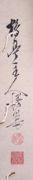 • 解説 紙本墨筆 本紙138×39cm 合箱 (本紙に経年ヨゴレと左端虫損、表具にシミと少イタミ、表具裏にシミとヨゴレ) *落款印章の画像有