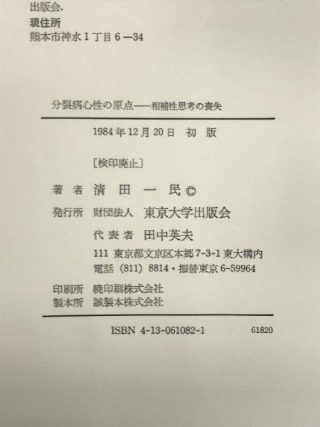 分裂病心性の原点―相補性思考の喪失 東京大学出版会 清田 一民