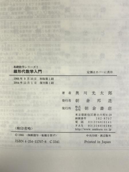 線形代数学入門 (基礎数学シリーズ) 朝倉書店 奥川 光太郎