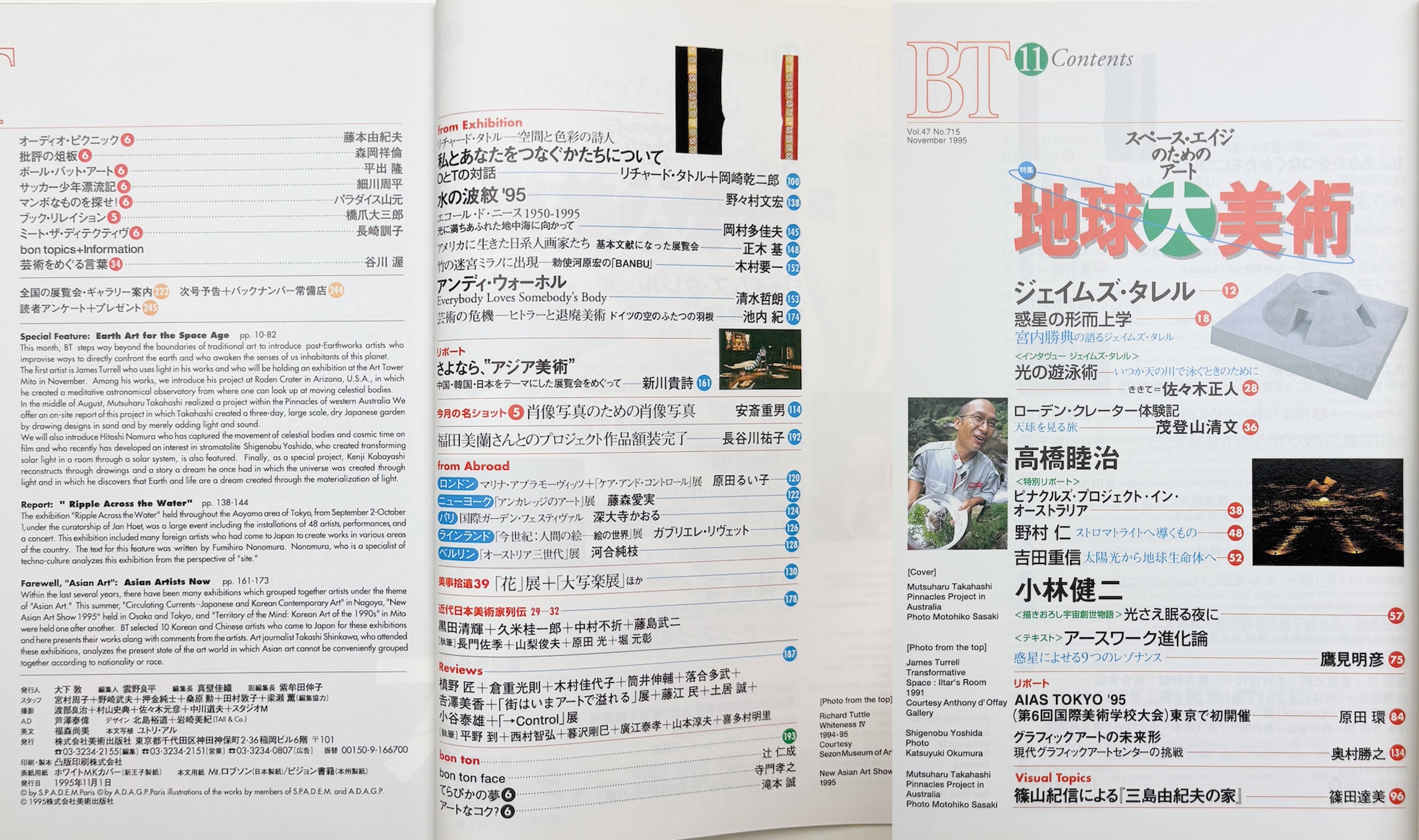 ジェイムズ・タレル, ローデン・クレーター, 佐々木正, 茂登山清文, 高橋睦治, ピナクルズ・プロジェクト・イン・オーストラリア, 野村仁, ストロマトライト, 吉田重信, 小林健二, 鷹見明彦, AIAS TOKYO '95(第6回国際美術学校大会), 原田環, 奥村勝之, 篠山紀信, 三島由紀夫の家, 篠田達美, リチャード・タトル, 岡崎乾二郎, 水の波紋'95, 野々村文宏, エコール・ド・ニース1950-1995, 岡村多佳夫, 正木基, 勅使河原宏, BANBU, 木村要ー, アンディ・ウォーホル, 芸術の危機 ヒトラーと退廃美術 ドイツの空のふたつの羽根, 池内紀, 新川貴詩, 肖像写真のための肖像写真, 安斎重男, 福田美蘭, 長谷川祐子, マリナ・アブラモーヴィッツ, 「ケア・アンド・コントロール」, 展, 原田るい子, 「アンカレッジのアート」展, 藤森愛実, 国際ガーデン・フェスティヴァル, 深大寺かおる, 「今世紀:人間の絵 絵の世界」展, ガブリエレ・リヴェット, 「オーストリア三世代」展, 河合純枝, 「花」展, 「大写楽展」, 黒田清輝, 久米桂一郎, 中村不折, 藤島武二, 長門佐季, 山梨俊夫, 原田光, 堀元彰, 横野匠, 倉重光則, 木村佳代子, 筒井伸輔, 落合多武, 吉澤美香, 「街はいまアートで溢れる」展, 蔵江民, 土居誠, 小谷泰雄, 「→Control」展, 平野到, 西村智弘, 暮沢剛巳, 藤江泰孝, 山本淳夫, 喜多村明里, 辻仁成, 寺門孝之, 滝本誠, 藤本由紀夫, 森岡祥倫, 平出隆, 細川周平, パラダイス山元, 橋爪大三郎, 長崎訓子, 谷川渥