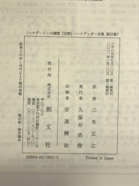 ヘルダーリンの讃歌『回想』 (ハイデッガー全集) 創文社 M. ハイデッガー