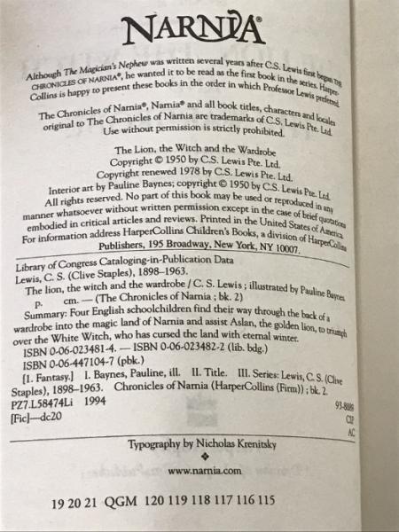 洋書 C.S. Lewis BOOK 2 THE LION, THE WITCH AND THE WARDROBE THE CHRONICLES OF NARNIA Harper ナルニア国物語 ライオンと魔女