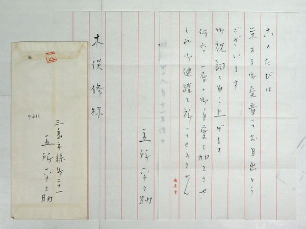 五所平之助書簡 木俣修宛 毛筆書2枚 封付 受賞祝詞
