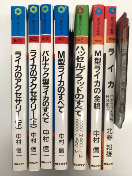 現代カメラ新書 No.60: ライカ ウアライカからR3まで 北野邦雄・著 / 現代カメラ新書 No.93: M型ライカの全貌 中村信一・著 / 現代カメラ新書別冊 中型カメラシリーズ No.3: ハッセルブラッドのすべて 朝日ソノラマ・編 / 現代カメラ新書別冊 35ミリ一眼レフシリーズ No.17: M型ライカのすべて 中村信一・著 / 現代カメラ新書別冊 35ミリ一眼レフシリーズ No.20: バルナック型ライカのすべて 中村信一・著 / 現代カメラ新書別冊 35ミリ一眼レフシリーズ No.22: ライカのアクセサリー(上) 中村信一・著 / 現代カメラ新書別冊 35ミリ一眼レフシリーズ No.23: ライカのアクセサリー(下) 中村信一・著 計7冊セット