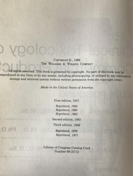 • 解説 Clinical Toxicology of Commercial Products: Acute Poisoning, 3rd Edition (1969). Published in 1969 by The Williams & Wilkins Co., this third edition was authored by leading toxicologists Marion N. Gleason, Robert E. Gosselin, Harold C. Hodge, and Roger P. Smith. It was a key reference for emergency medicine and public health professionals during a time when household and commercial chemicals were rapidly increasing. The book guided the diagnosis and treatment of acute poisoning from these products. Third (First edition 1957). Cover: Blue cloth with skull-and-crossbones motifs, titles in black and gold. Condition: Grade B, with age wear, stains, scuffed corners, and tanning, but structurally sound. Large format (≈28.5–29 cm). Collector’s Value: A historical and visually unique resource for toxicology and medical history enthusiasts.