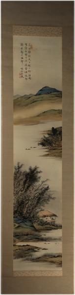 • 解説 絹本着色 自題共箱 青緑山水 127×27㎝ 愛媛県の画家。南画界の重鎮、芸術院賞、大阪府芸術賞、日本南画院会長。