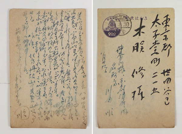 川田順葉書 木俣修(木?修)宛ペン書11行 シミ有