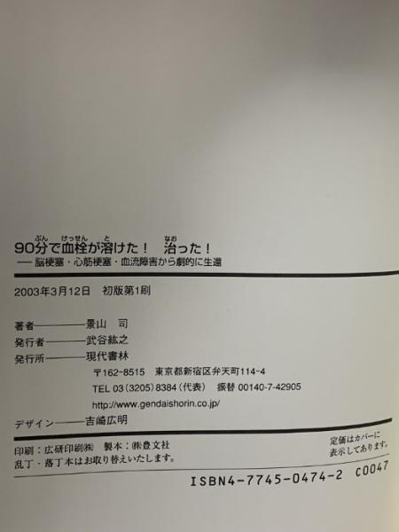 90分で血栓が溶けた!治った! 脳梗塞・心筋梗塞・血流障害から劇的に生還 現代書林 景山 司 久郷 晴彦 東山 明憲