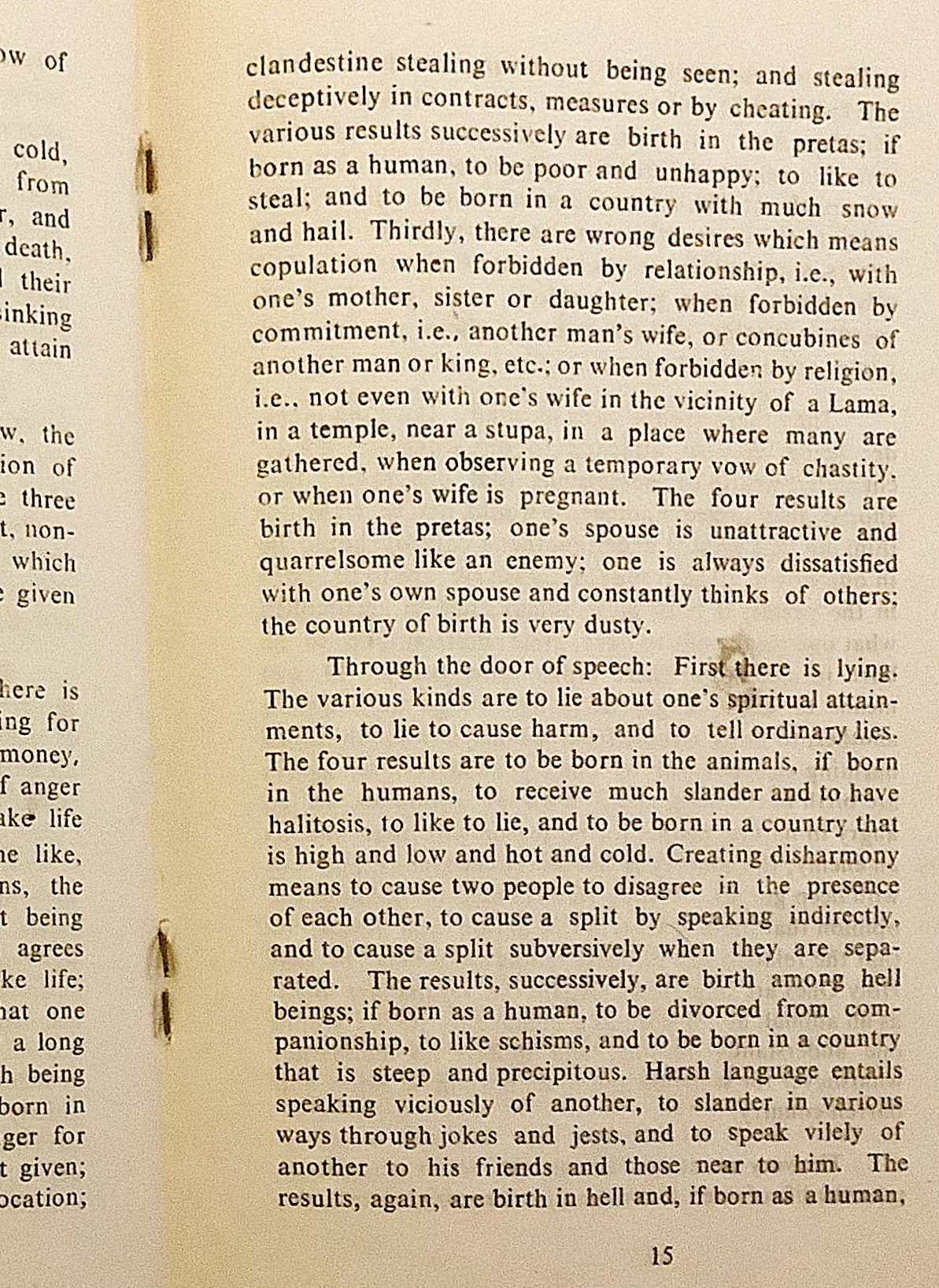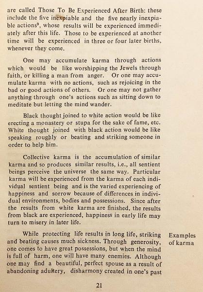 本文では、輪廻から離れるための心の備えが具体例とともに示され、怒りや執着などの心が行為となり、その結果が成熟していく仕組みが平明に説明されます。善行が安らぎをもたらし、悪行が混乱や苦しみを招く因果の働きが描かれ、瞑想は技法ではなく、正しい理解と行為によって深まるという伝統的視点が一貫しています。