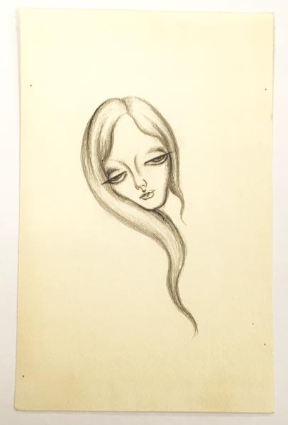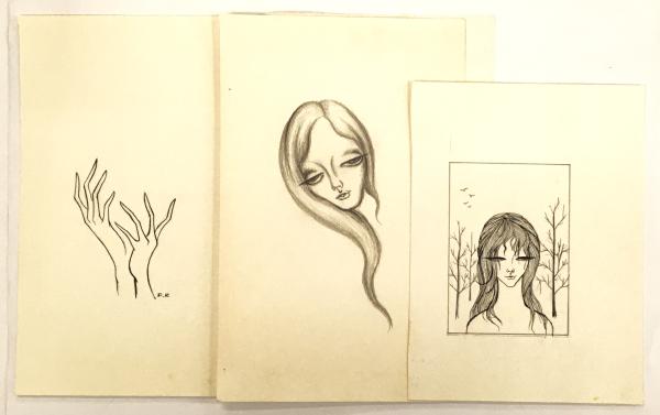 • 解説 ①鉛筆素描「女性図」(『雨月物語』):22x14㎝・裏面「ギャラリー吾八」印・四ヵ所ピンホール