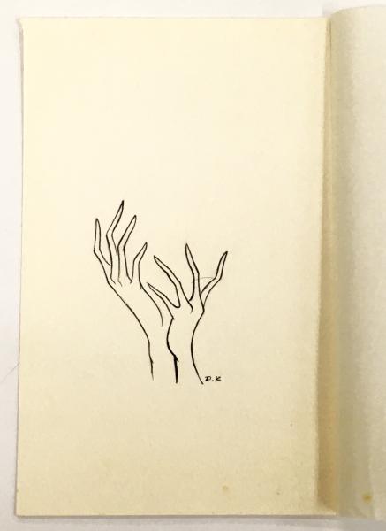 ②ペン画「手」:22x14㎝・「D.K」サイン・パラフィン少シミ