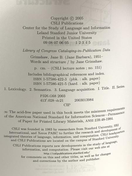 洋書 Words and Structure (Csli Lecture Notes 151) Stanford Univ Center for the Study Jane B.Grimshaw