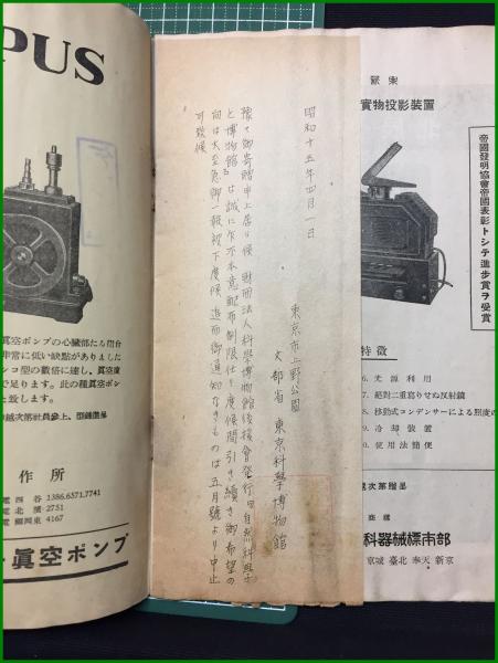 • 解説 ●昭和15年 見返し:東京科学博物館から贈呈中止の文書有 ヤケ シミ 金具サビ オレ 表紙印有