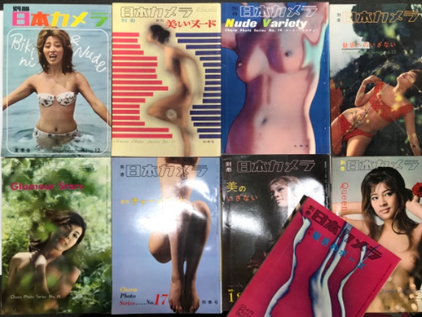 別冊日本カメラ No.1-No.20まで17冊セット ①No.1 グラマーフォトグラフィー 中村正也・羽田敏雄・黒川清司・山田照夫=昭和33年10月1日発行、113頁 / ②No.2 グラマーフォト8人の写真家と魅惑の世界 早田雄二・長谷部欣宏・三浦波夫・水野イサオ・小林晃・内田伊佐夫・岩宮武二・杵島隆=昭和34年1月1日発行、116頁 / ③No.3 グラマー・ハイライト=昭和34年4月1日発行、116頁 / ④No.4 水着とヌード=昭和34年7月1日発行、112頁 / ⑤No.8 Beauty Girls=昭和35年7月1日発行、96頁 / ⑥No.9 Charm Pose=昭和35年10月1日発行、104頁 ※背に目立つ剥がれ跡あり / ⑦No.10 新版 ヌード・グラマー=昭和36年1月1日発行、104頁 / ⑧No.11 花とグラマー=昭和36年4月1日発行、104頁 / ⑨No.12 ビキニとヌード=昭和36年7月1日発行、110頁 / ⑩No.13 新版 美しいヌード=昭和36年10月1日発行、110頁 / ⑪No.14 ヌード・バラエティ=昭和37年1月1日発行、110頁 / ⑫No.15 魅惑へのいざない=昭和37年4月1日発行、108頁 / ⑬No.16 グラマースターズ=昭和37年7月1日発行、107頁 / ⑭No.17 新作チャームフォト=昭和37年10月1日発行、108頁 / ⑮No.18 美へのいざない=昭和38年1月1日発行、108頁 / ⑯No.19 クィーンオブヌード=昭和38年4月1日発行、108頁 / ⑰No.20 新版 魅惑のポーズ=昭和38年7月1日発行、108頁