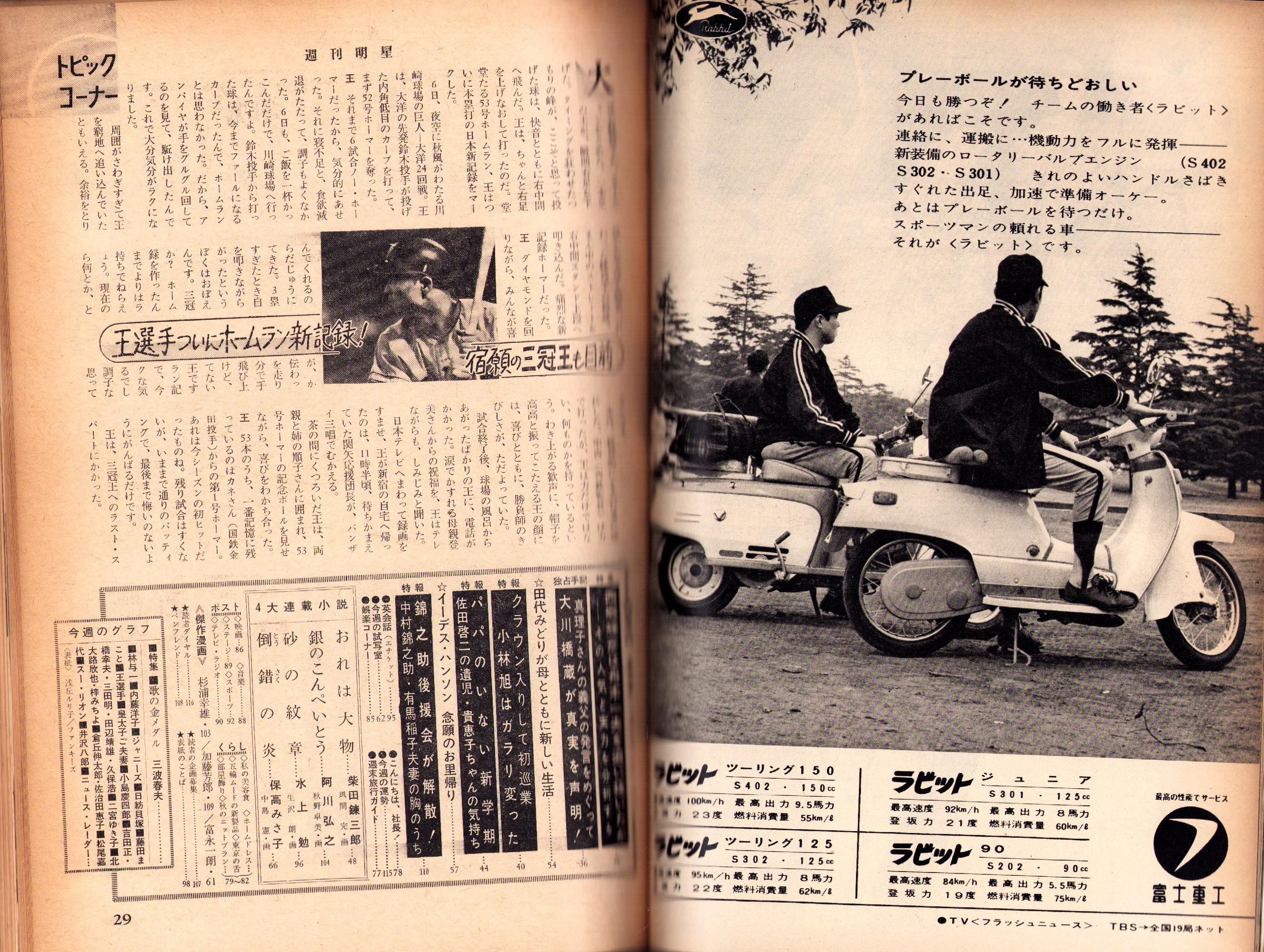 • 著者 〈林与一 カラー3頁〉〈内藤洋子、ジャニーズ 各カラー2頁〉〈三波春夫 モノクロ7頁〉〈勢揃い五人組 -吉田正、橋幸夫、三田明、田辺靖雄、久保浩- モノクロ3頁〉〈井沢八郎の新居拝見 モノクロ2頁〉〈王貞治 モノクロ3頁〉〈藤田まこと、北大路欣也と梓みちよ、倉丘伸太郎と佐治田恵子、松尾嘉代、坂本九と九重佑三子、小島慶四郎 モノクロ2頁〉〈二宮ゆき子 モノクロ1頁〉〈西郷輝彦は舟木一夫を追い抜いたか -その人気と実力を分析する- 5頁〉〈独占手記 真理子さんの義父の発言をめぐって大川橋蔵が真実を声明! 4頁〉〈名実ともに美空ひばりと別れて小林旭はガラリ変った 4頁〉〈パパのいない新学期 -佐田啓二の遺児・貴恵子ちゃんの気持ち- 3頁〉〈一家離散した田代みどりが母とともに新しい生活 3頁〉〈錦之助後援会が解散! -中村錦之助・有馬稲子夫妻の胸のうち- 4頁〉、柴田錬三郎、阿川弘之、水上勉、保高みさ子