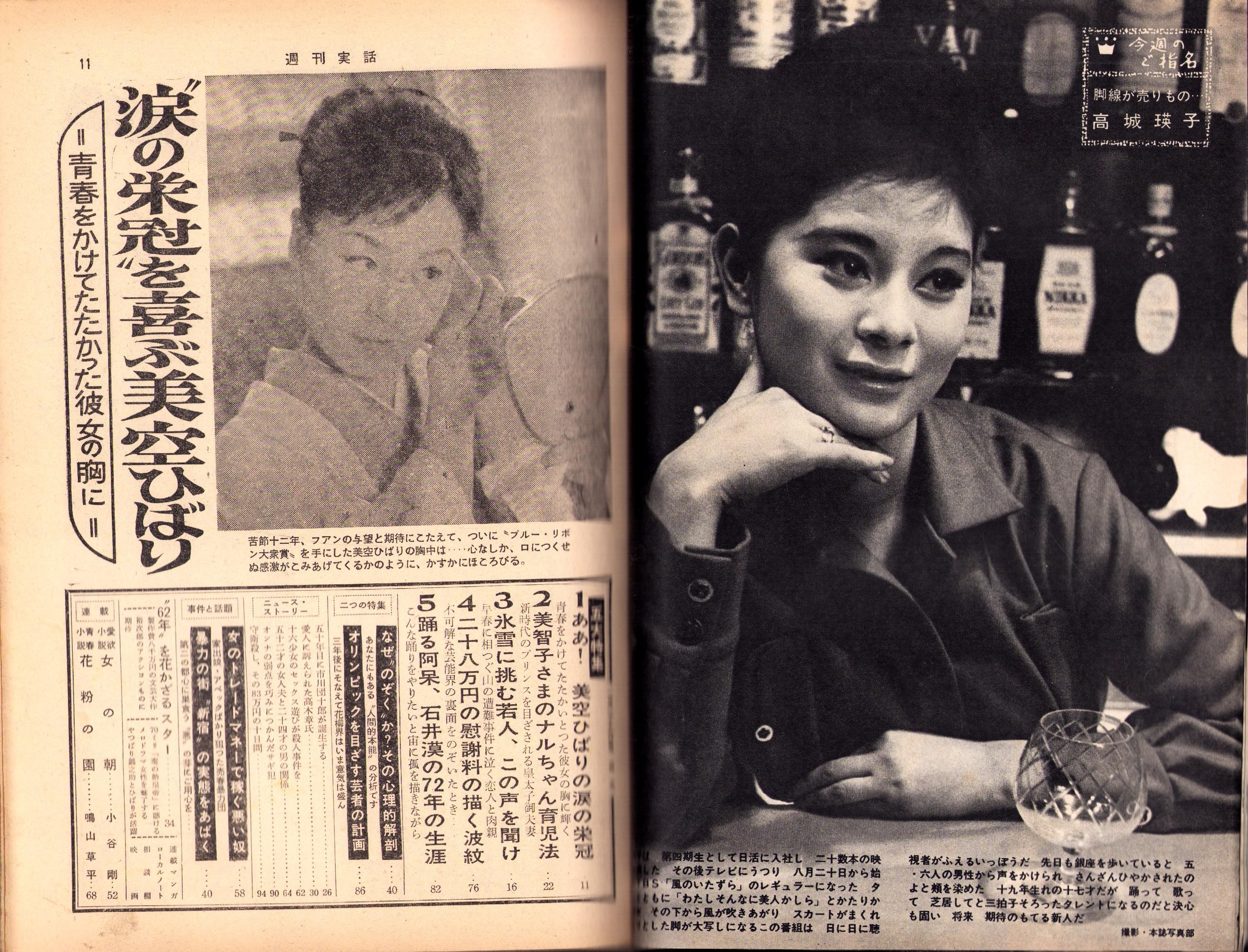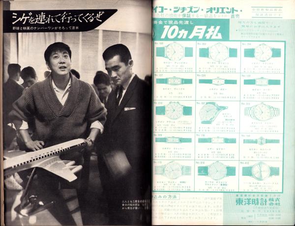 • 著者 〈野球と映画のナンバーワンがそろって渡米(石原裕次郎と長嶋茂雄)モノクロ3頁〉〈東映作品に出演した大空真弓とスケートを楽しむ佐久間良子 モノクロ3頁〉〈市川雷蔵の婚約者 モノクロ2頁〉〈今週のご指名 -高城瑛子- モノクロ1頁〉〈“涙の栄冠”を喜ぶ美空ひばり 5頁〉〈50年目に市川団十郎(11代目)が誕生する 3頁〉〈28万円の慰謝料請求がえがいた波紋(千葉敏郎)6頁〉〈『踊るアホウ』石井漠の72年の生涯 3頁〉、小谷剛、鳴山草平