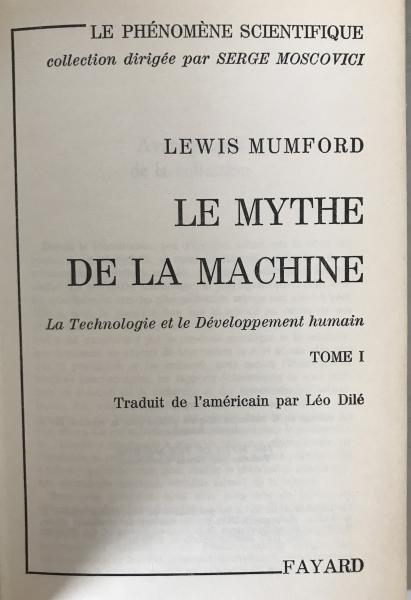 • 解説 This is a complete two-volume 1973–1974 French edition of Lewis Mumford’s The Myth of the Machine, translated by Léo Dilé and published by Fayard in Serge Moscovici’s “Le Phénomène Scientifique” series. Includes Tome I: La Technologie et le Développement humain and Tome II: Le Pentagone de la puissance. Condition: Good (B), with very heavy age-toning and minor cover wear; both volumes remain structurally sound. A scarce early French presentation of Mumford’s critique of technological power—highly collectible for scholars of STS, environmental philosophy, and modern intellectual history.