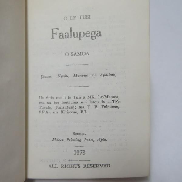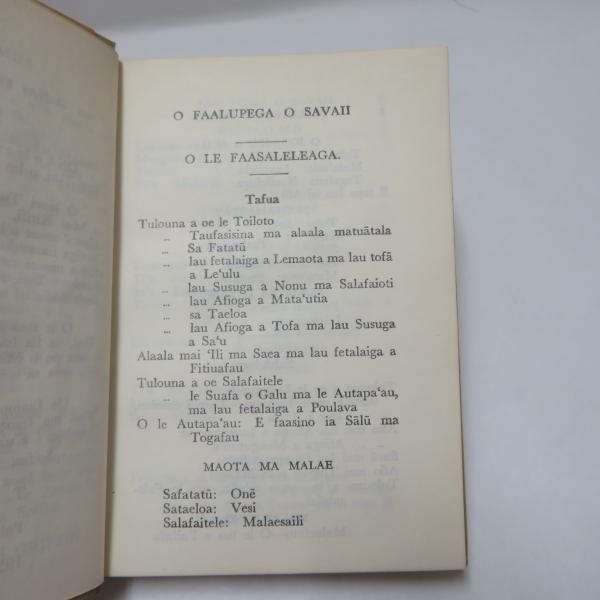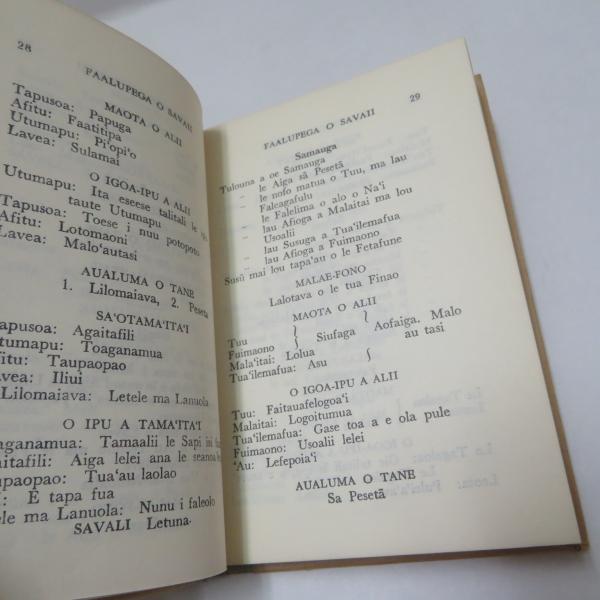 • 解説 ◆サモア語:サバイイ島、ウポル島、マノノ島、アポリマ島の各村落におけるチーフ(首長)への適切な呼びかけ方や敬称がまとめられた本と思われる。