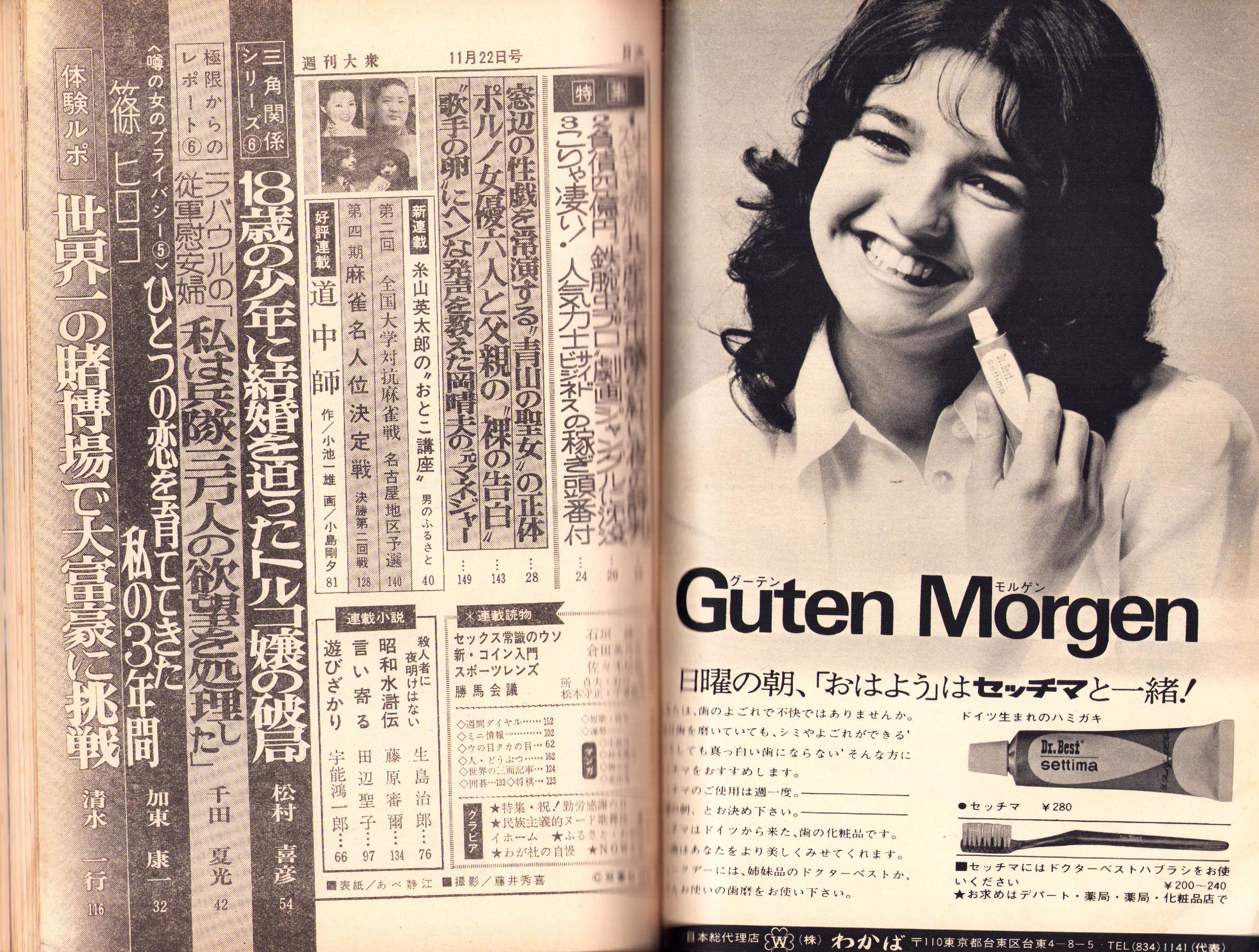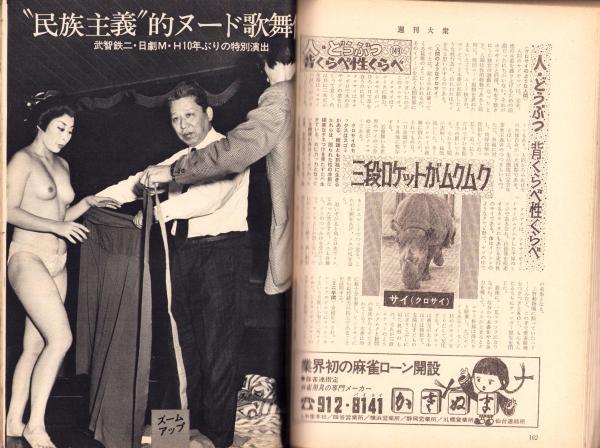 • 著者 〈“民族主義”的ヌード歌舞伎 -武智鉄二・日劇M・H10年ぶりの特別出演- モノクロ4頁〉〈NOWな女・紅谷洋子 カラー1頁〉〈負債4億円“鉄腕虫プロ”劇画ジャングルに沈没 4頁〉〈噂の女のプライバシー -篠ヒロコ- 5頁〉〈18歳の少年に結婚を迫ったトルコ嬢の破局 7頁〉〈ポルノ女優6人と父親の“裸”の告白 -田中真理、谷ナオミ、中島葵、桃井かおり、片桐夕子、続圭子- 6頁〉〈「それ行け!マイ・ダーリン -柳家小さん、相沢英之、山田太郎、長沢純、牟田悌三、山崎唯、前田武彦、青島幸男、小松方正ほか-」カラー&モノクロ11頁〉、生島治郎、藤原審爾、田辺聖子、宇能鴻一郎