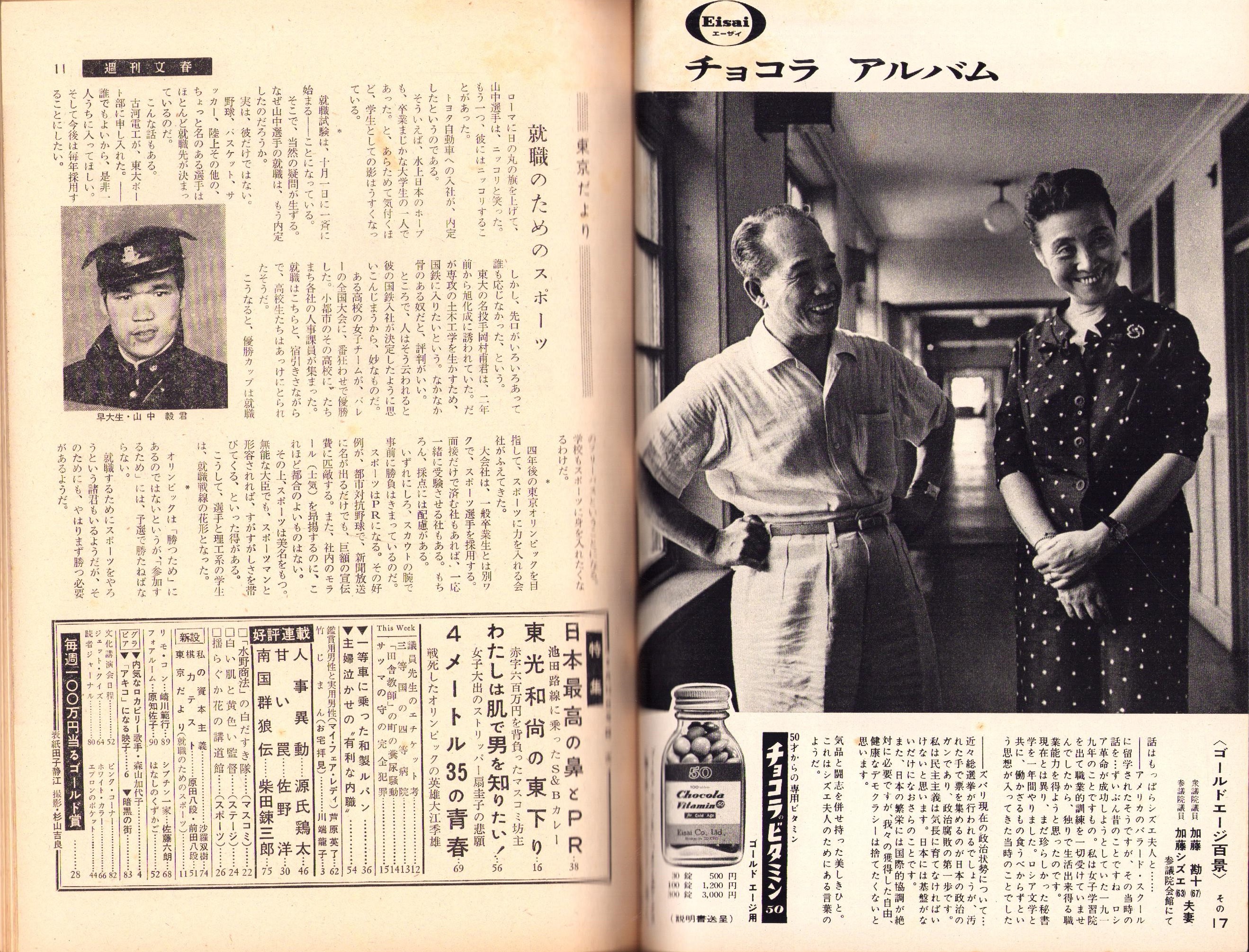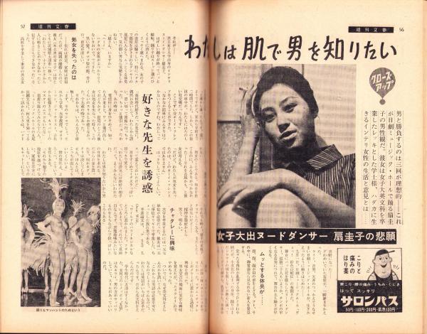 • 著者 〈ジャズ界の新人・禅寺育ちの森山加代子 カラー2頁〉〈イタリア映画に出演する若林映子 モノクロ3頁〉〈今東光和尚の東下り -赤字600万を背負ったマスコミ坊主- 6頁〉〈女子大出ヌードダンサ扇圭子の悲願 5頁〉〈戦死したオリンピック棒高飛びの英雄・大江季雄 5頁〉、源氏鶏太、佐野洋、柴田錬三郎